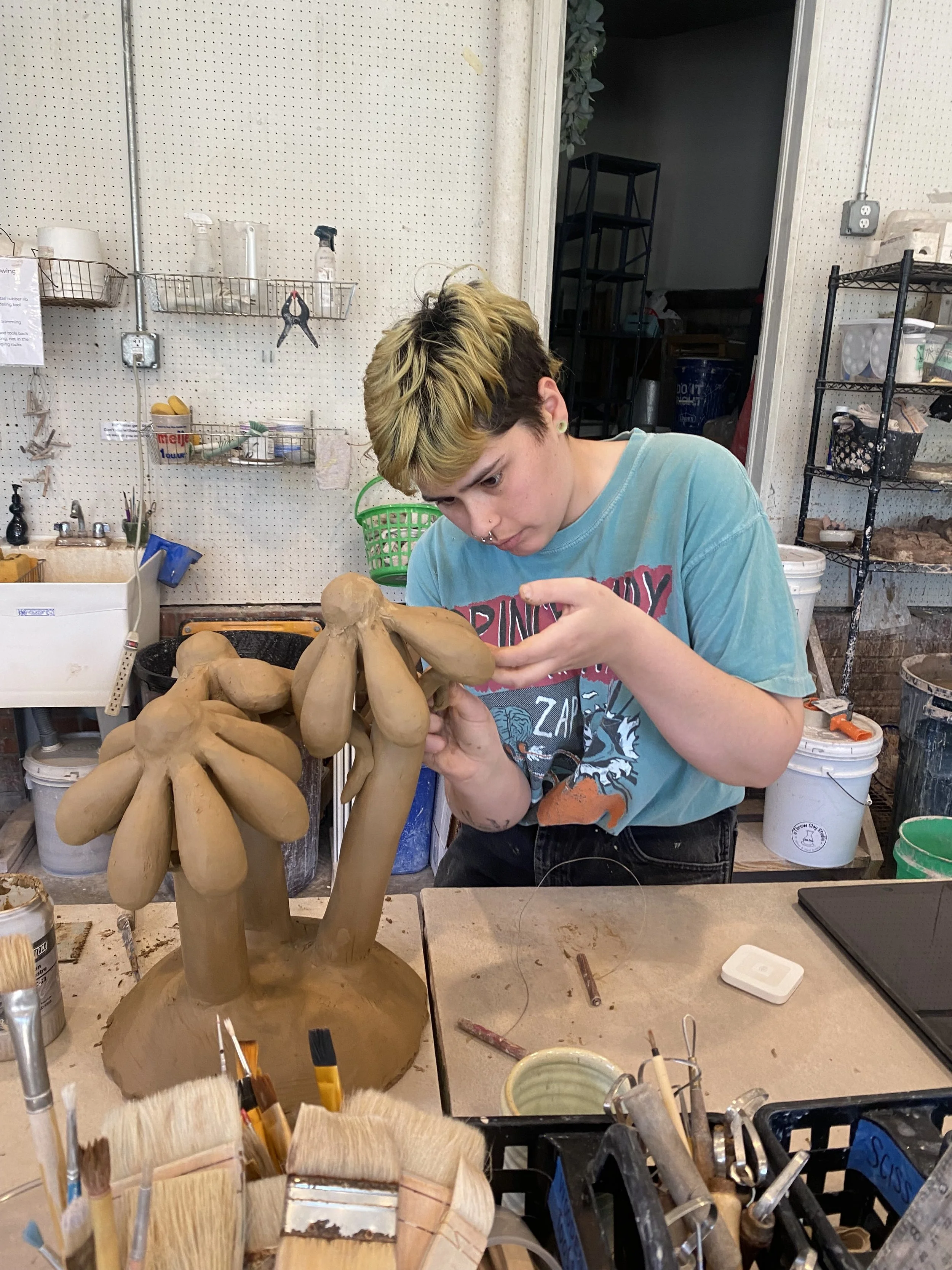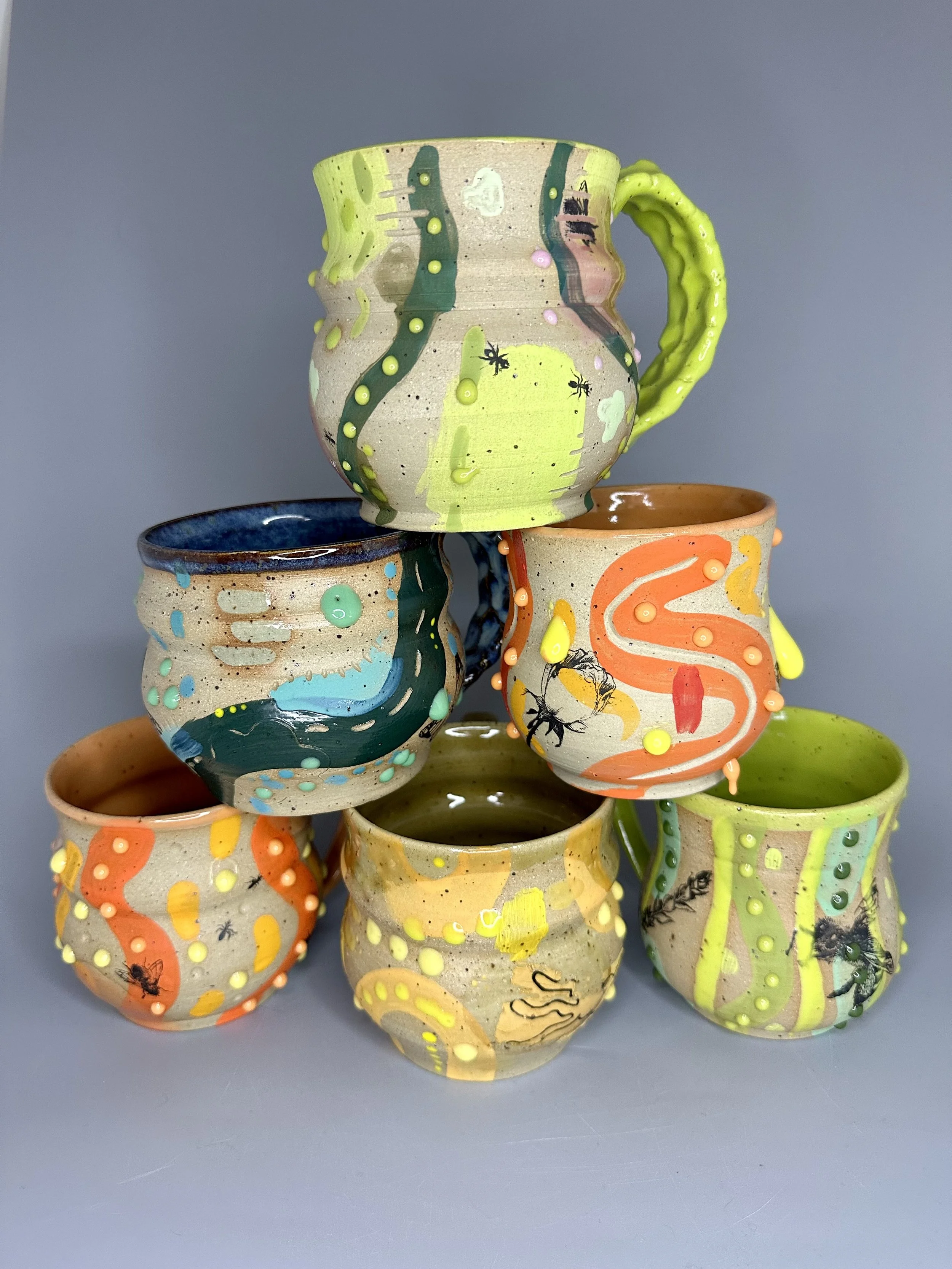 Katya Reinhard is a ceramic artist based out of Indianapolis, Indiana. They have been working in clay since early childhood and graduated with a Bachelors in Fine Arts with a focus in ceramics from Herron School of Art and Design in 2021. Their work serves as a way to brighten any day in the most mundane of places, your kitchen cabinet. The use of different textures and surface treatments keeps the user stimulated at all turns and encourages fidgeting! They take inspiration from their day to day experiences as a queer and neurodivergent artist through self adornment and a deep interest in creepy crawly creatures imagined and real.